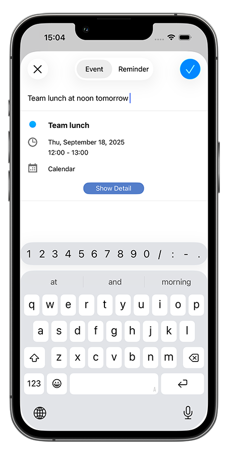 FirstSeed Calendar has a powerful natural-language processing engine that lets you almost "speak" to the app to enter a new event or reminder. So you can type "Dinner at 7 pm tonight" or "Remind me to call John at noon". Or better yet, you can use Siri’s voice dictation to create new events or reminders by merely speaking directly to your phone.