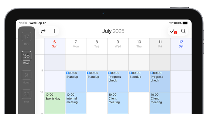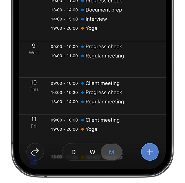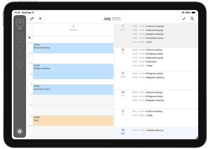 Haben Sie sich jemals gefragt, wieso die Wochenansicht vertikales Scrollen benötigt? Wir schon. Und wir haben die Wochenansicht so gestaltet, dass Sie nicht vertikal scrollen müssen. Die Wochenansicht im FirstSeed Calendar zeigt Ihnen die für Sie wichtigste Zeit im Rasterstil an, während der Rest der Ereignisse als Liste angezeigt wird.