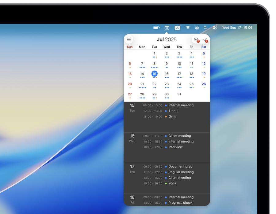 Außerdem wird ein Mini-Fenster in der Menüleiste angezeigt, sodass Sie noch schneller auf Ihre Ereignisse und Erinnerungen zugreifen können. Die App unterstützt auch das Benachrichtigungscenter, TouchBar, Drag & Drop, Vollbild, dunklen Modus, Widgets in macOS 11 Big Sur und mehr, um sich ausgezeichnet im macOS-Ökosystem zurecht zu finden.